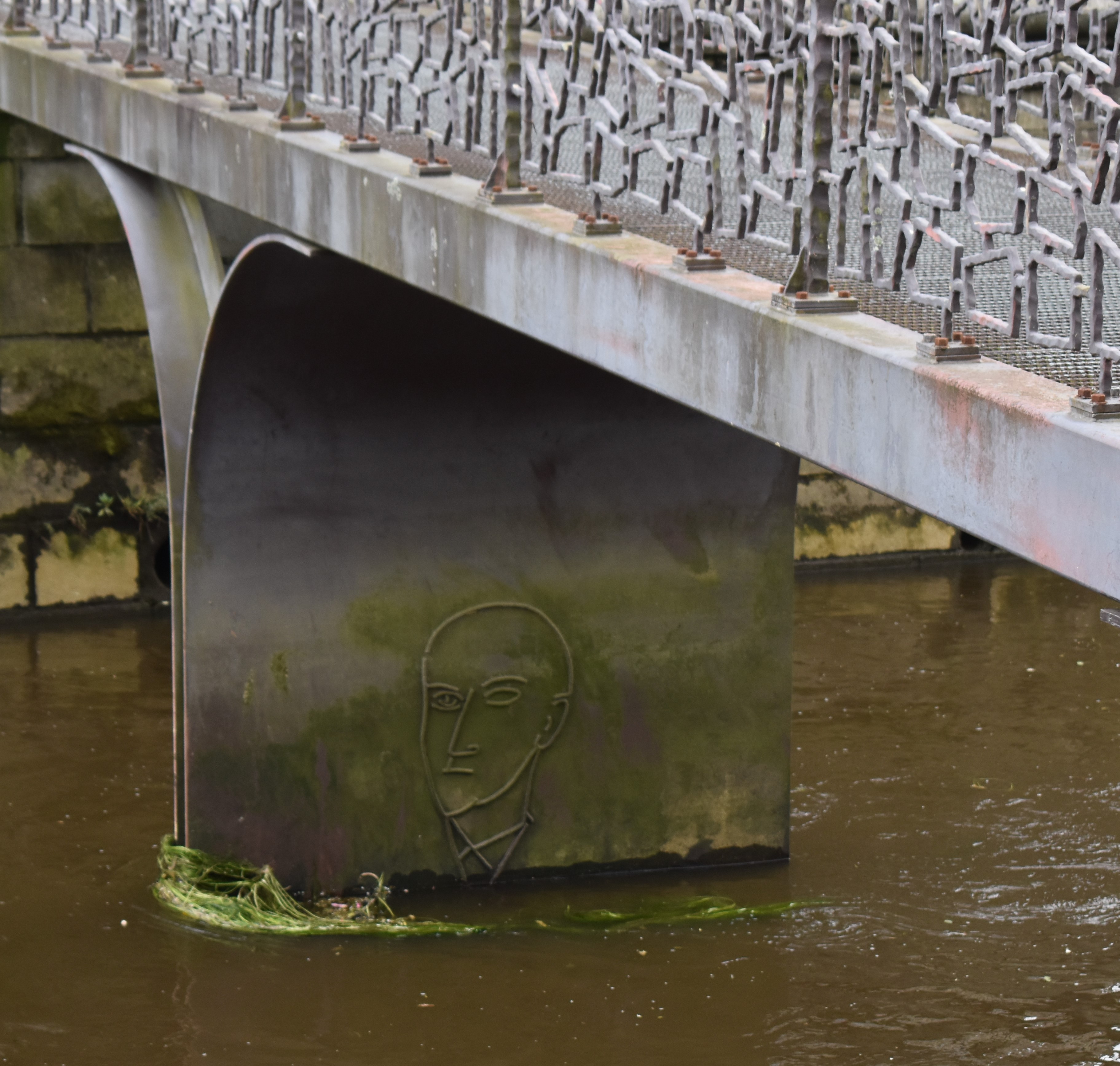 The river Odet flows through the city and is crossed by many bridges and foot over-bridges, all of which have flowers growing alongside. This is the only bridge without flowers, to symbolise his tragic death in the internment camp. On the ramps are extracts from his works. The Odet flows directly into the sea and its levels rise and fall with the tides. Max Jacob’s face can be seen only at low tide. On a less serious note, if one looks closely, one of his eyes is closed, as if to wink at the viewer who has caught sight of his face.