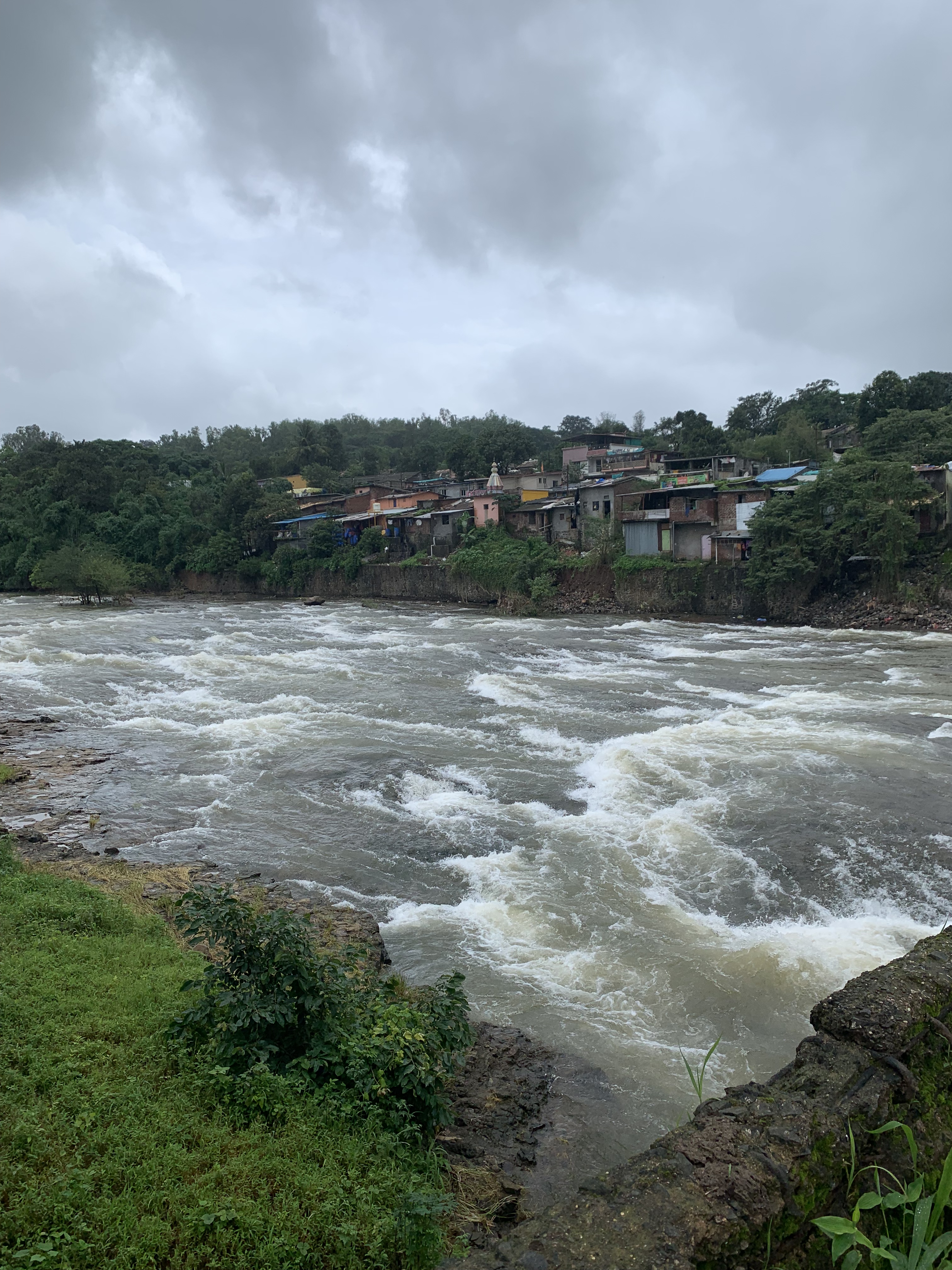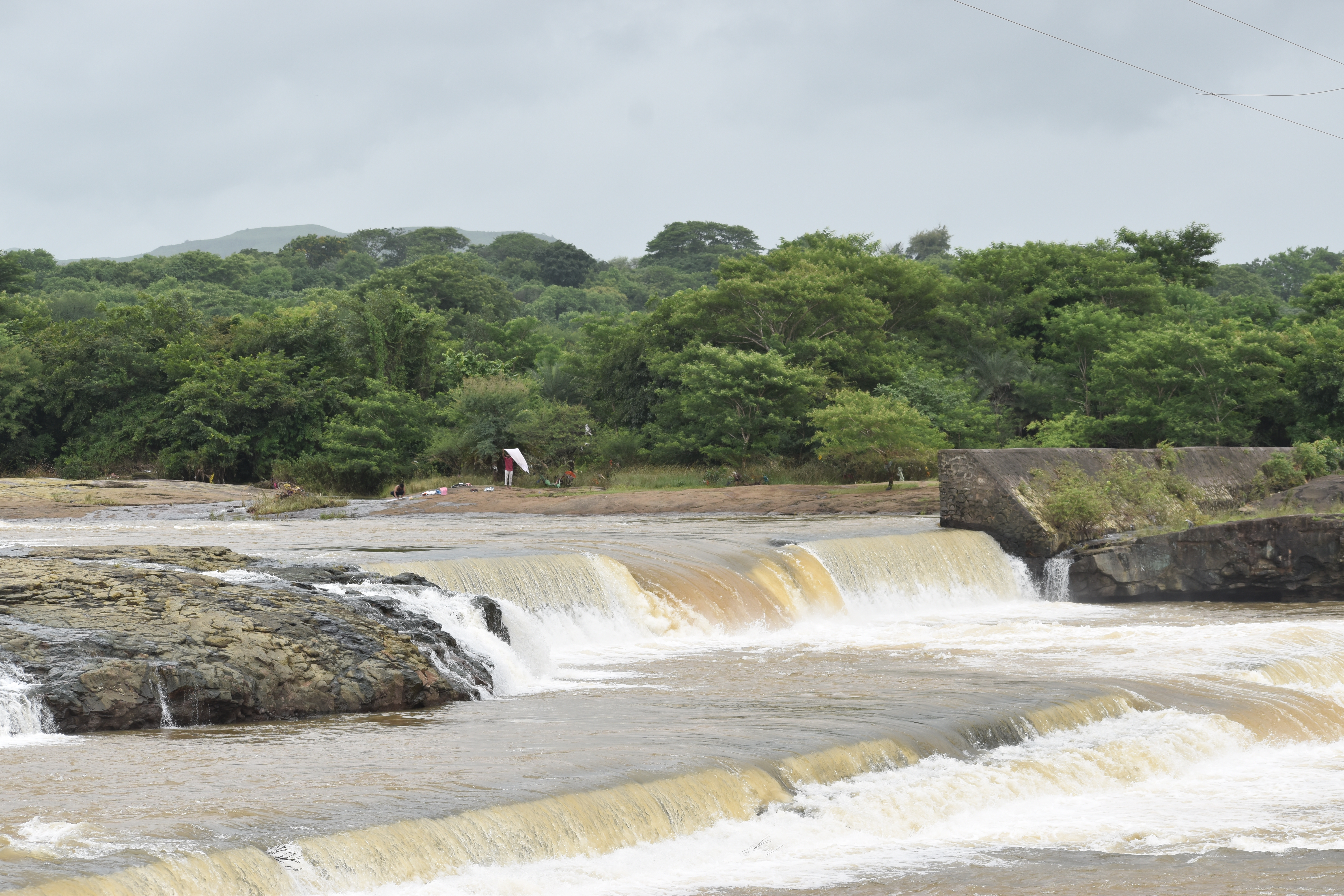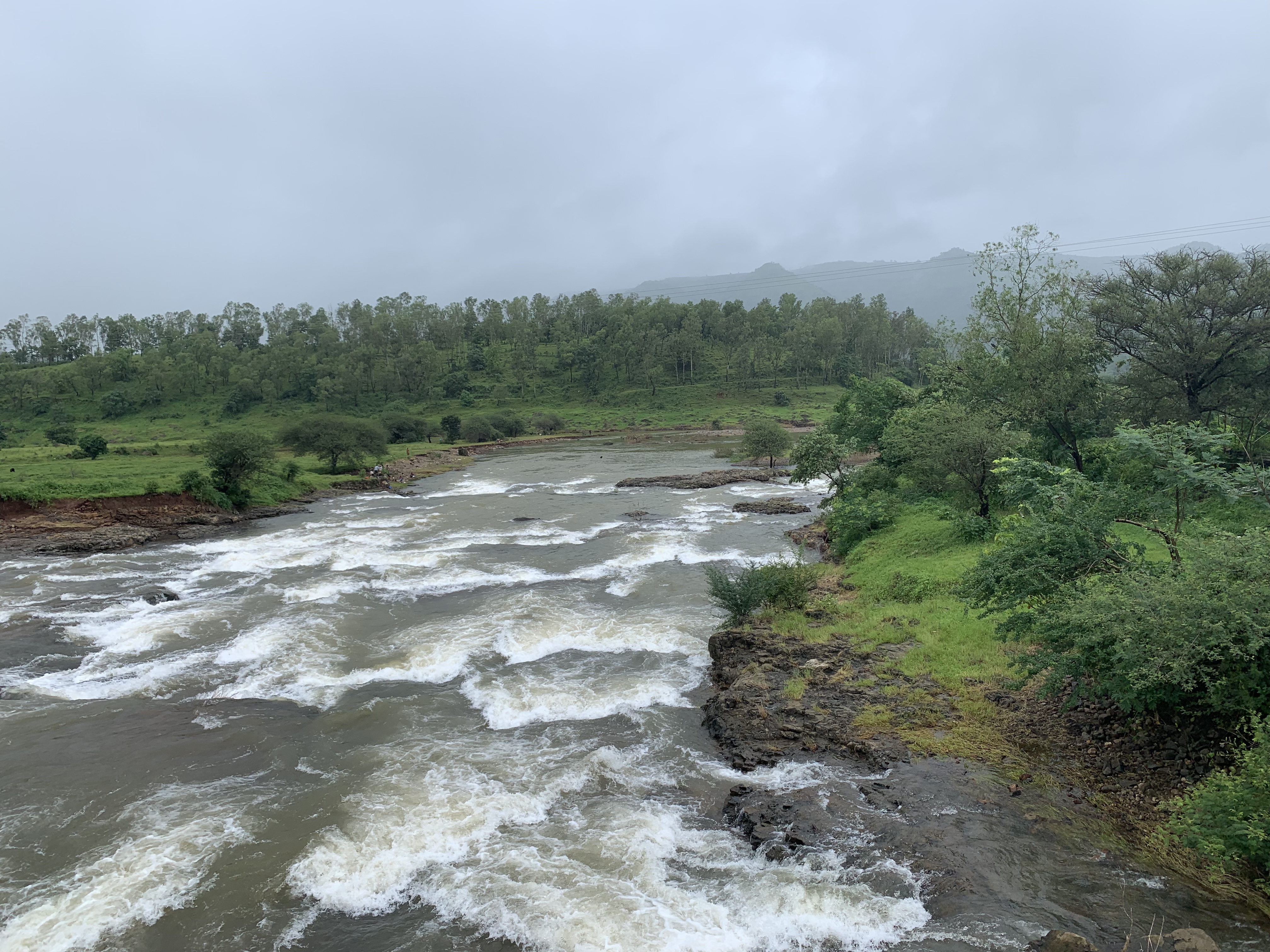 We proceeded on our dam-darshan as we followed the bends and curves of the river, past villages and fields till we approached the second dam. Here too we could make out that the gates were open as we saw around us larger streams of water rushing down to join the river. The newspaper headline “Rainfall in the catchment areas” made a whole lot more sense now.