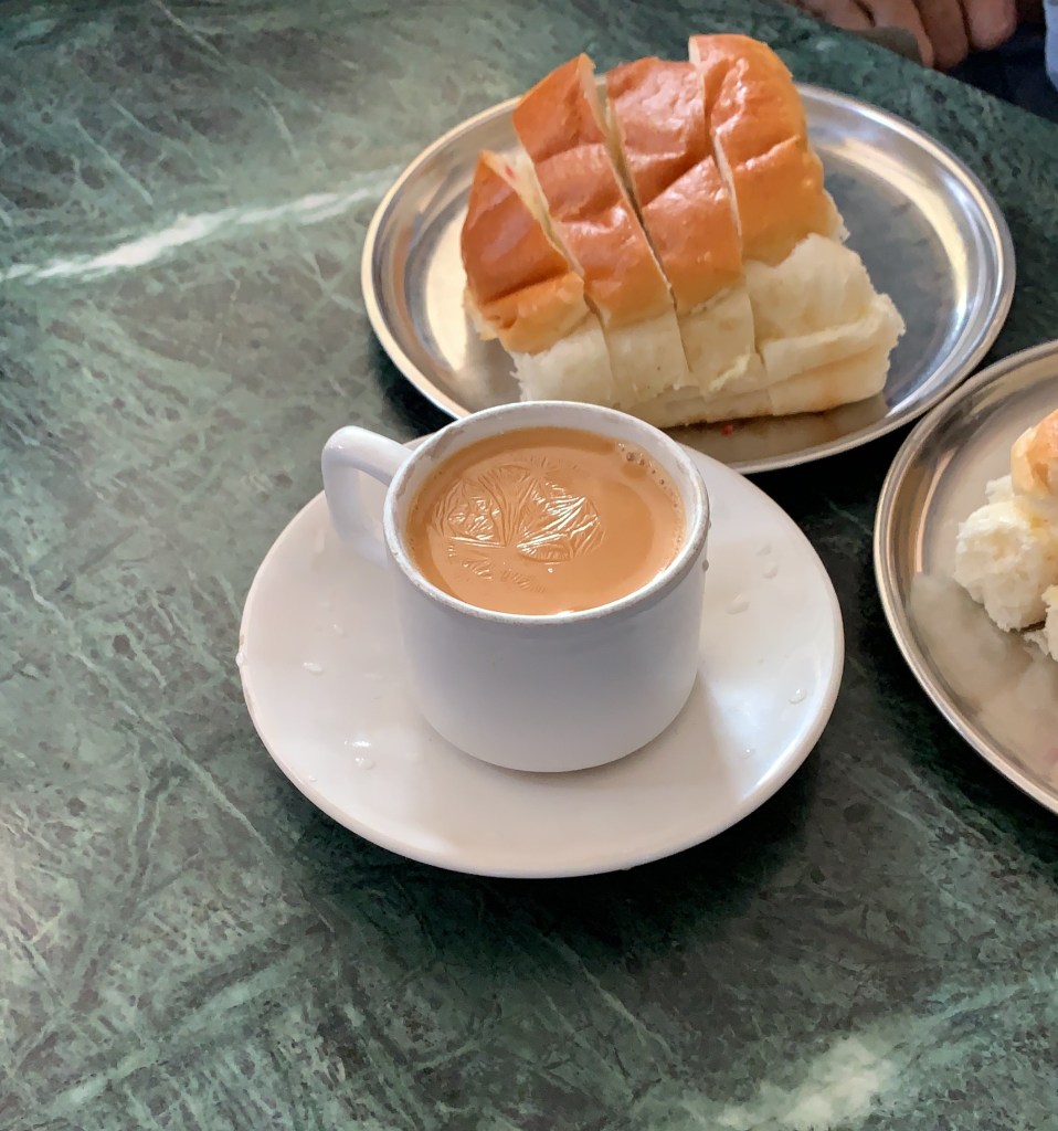 We continued on our way towards what was to be the main attraction of the tour- bun maska and Irani chai. At an authentic Irani cafe. Soon, there we were, parked at a table in Maha Naaz cafe, awaiting the arrival of the much anticipated goodies. Aside: I don’t drink tea and I had never sampled bun maska. And they are supposed to go together. Oh well, there’s a first time for everything!