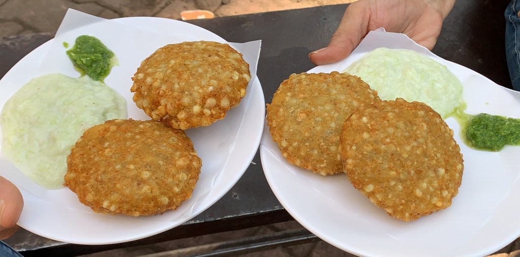We decided to wind up our food trail at a stall that I had eyed longingly several times in the past years, but had never sampled the wares thereof. This was street food, not nostalgia, but we gave it a try nevertheless. IT- was these hot, crisp and crunchy sabudana wadas just out of the ‘kadhai’. Served with spicy green chutney and slightly sweet cucumber ‘raitha’, they have to be gobbled up before they get soggy. So there we were, perched on an iron bench by the side of the road, digging into yummy sabudana wadas. After so many years of walking past this vendor and his cart- I finally got to stop for that bite. My food trail was complete.