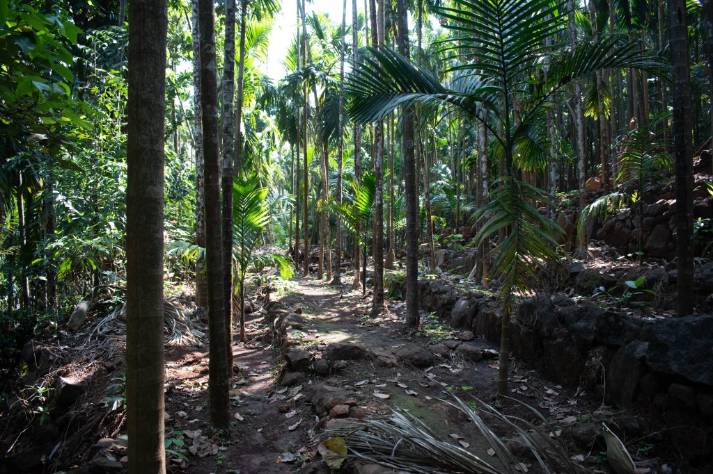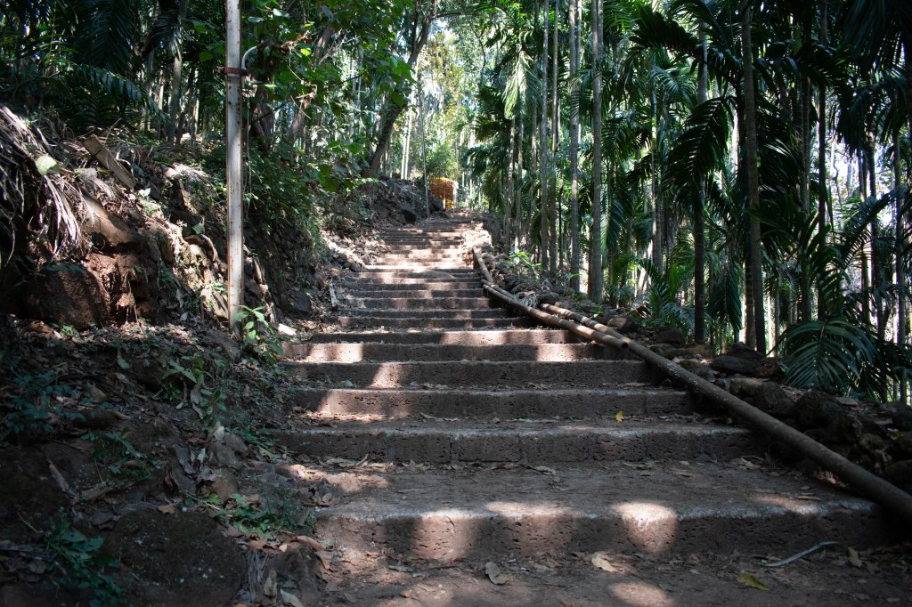 The plantation is scenically situated in a lovely green valley. There’s a narrow road leading down the valley and at one point one needs to get out of the vehicle and walk through the plantation to approach the 200 steps that go up to the temple. It’s a beautiful place, quiet, green and the only sound is the twittering of birds and the splash of water as it flows through the many channels that irrigate the trees. There are narrow lanes and paths that lead to the dwellings of the inhabitants. It’s idyllic.