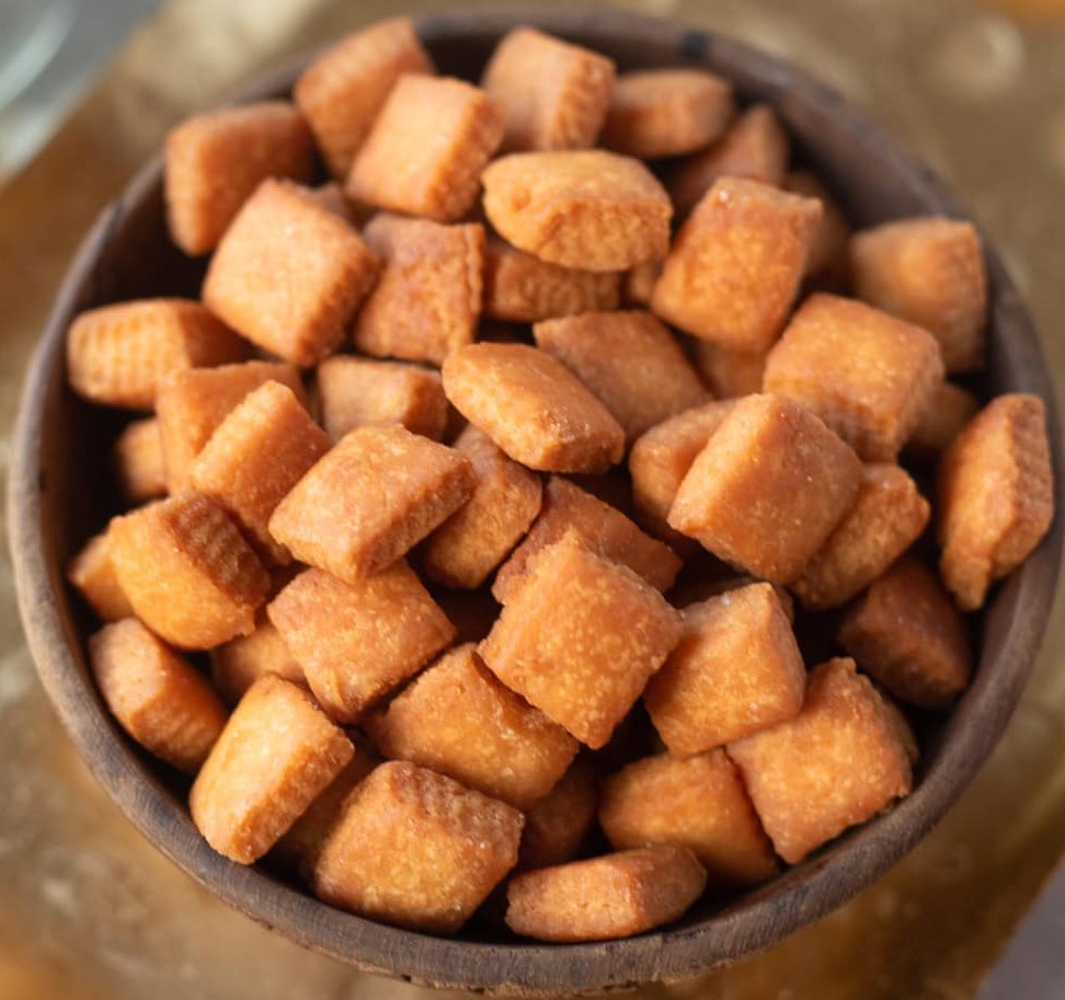 The ‘namak pare’ and ‘shakkar pare’ came next on the list. One savoury and the other sweet- making them was a two if not three person job. The person kneading the dough needed strong arms and a hefty punch to make a smooth, firm mixture. Next was the turn of the person rolling out the dough into large, round and even discs. This person was also expected to cut the discs into long strips which were then sliced into diamond shaped, bite-sized portions. A steady hand and an eye for geometry and symmetry was needed here. These were then laid out on newspaper sheets to dry and harden a little (I usually handled this last bit) so that they would fry faster.