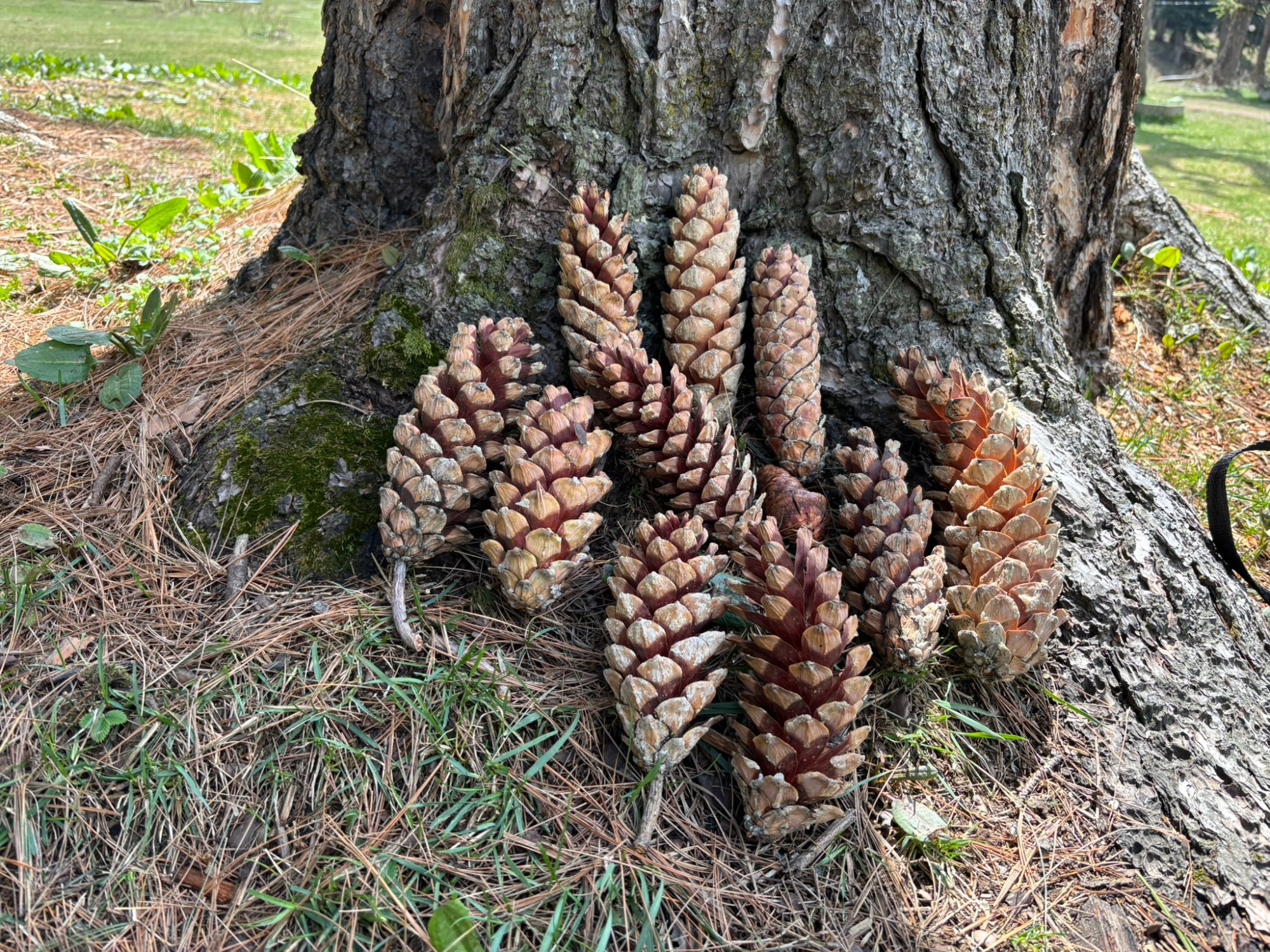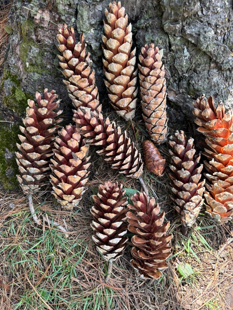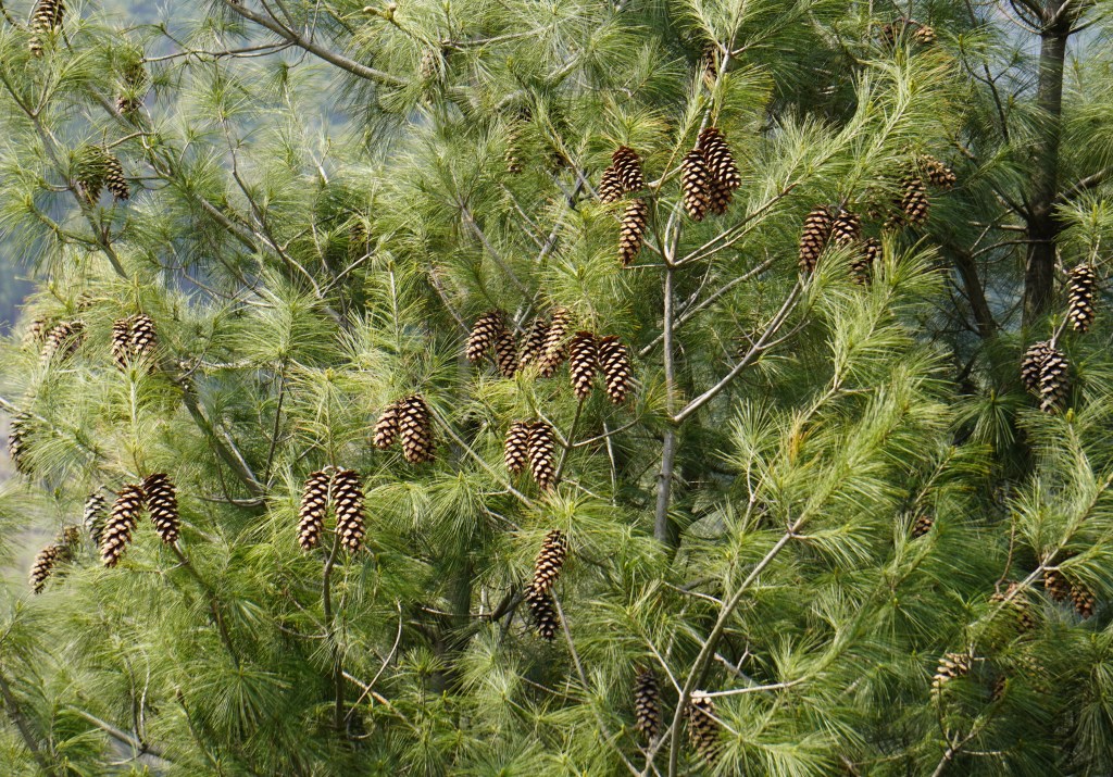But if you think I am now going to wax poetic about all the pine cones that I gathered and how I’ve decorated my house with them- you’re mistaken. Because I was able to bring back not a single pine cone from there. Nope, not a one. And that’s because when the cones drop from the trees, they carry with them a sticky white sap or resin that makes it difficult for a badly equipped cone-collector to gather. I had nothing to wrap them up in and no bag to keep them in. So I did the next best thing- picked up some of the best looking ones, arranged them at the foot of a ‘kaayur’ tree and took photographs. Maybe I’ll take printouts and arrange them around the house!