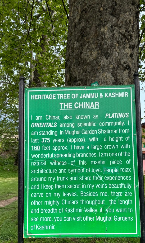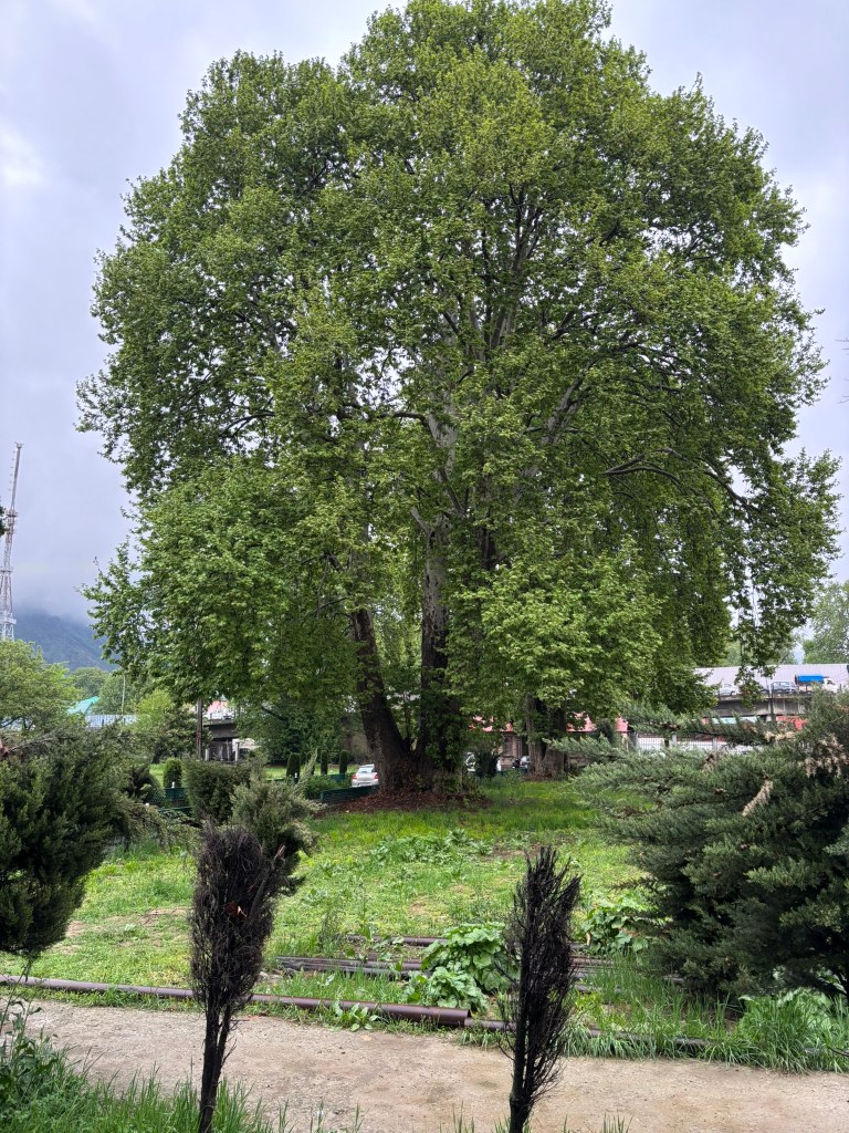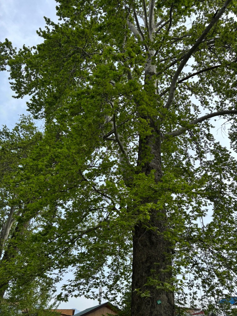 The other tree that fascinated us was of course the Chinar or ‘booen’. It is a majestic yet graceful looking tree that can grow up to a height of 100 feet and have a trunk that’s 40 feet in circumference. It’s origin is traced back to Greece but it is an inseparable part of the life and culture of the Kashmiris. The chinar was worshipped as Goddess Bhawani (hence the name Booen) and planted near temples by pandits and near shrines and holy sites by Sufi saints. The tree had traveled to Central Asia from Greece, so when the Mughals arrived in Kashmir and saw it, they gave it the name ‘chinar’ and planted it in their gardens. The chinar trees are considered sacred and are blessed with a lifespan of centuries- so unless they are felled in the name of ‘development’ they should be around for a long time.