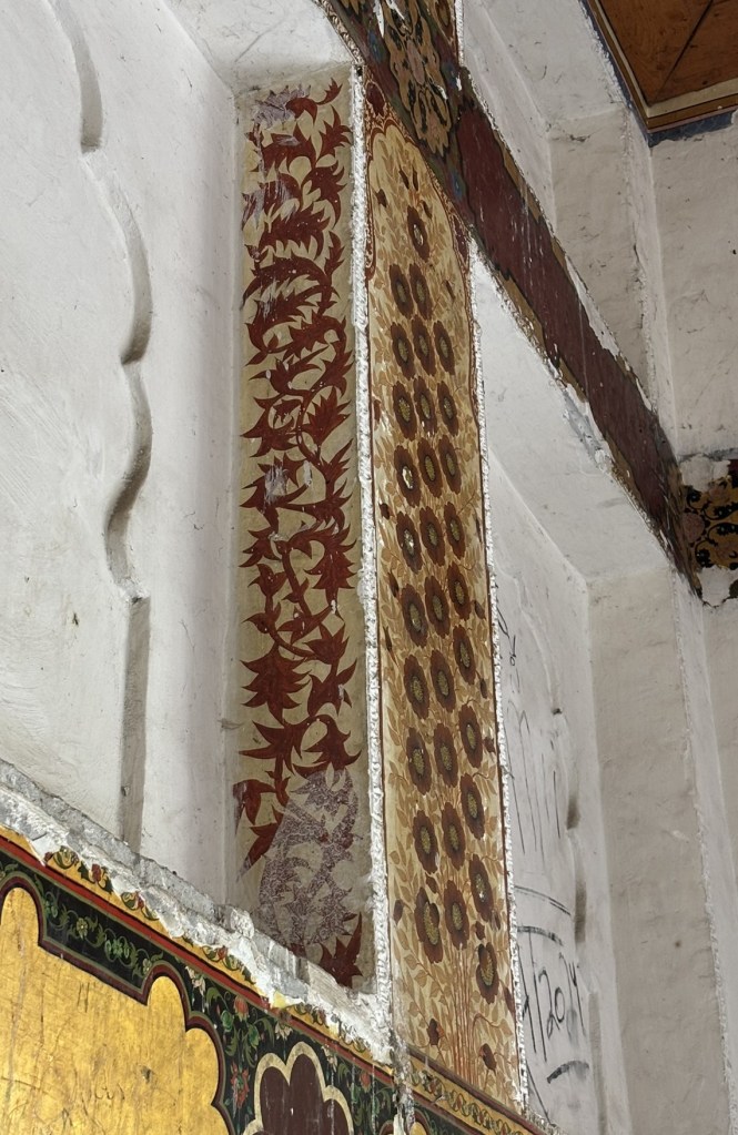 The crimson hued leaves of the chinar tree in autumn- adorning the walls of one of the terraces in Shalimar Bagh. The garden was built in 1619 by the Mughal emperor Jahangir. (Please ignore or unsee the graffiti on the wall and other signs of neglect.)