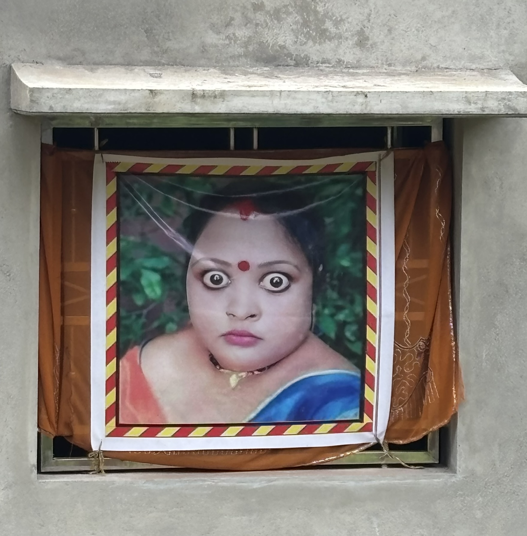 We saw this picture while driving past the paddy fields that lined the narrow roads as they wound their way through the villages of Gokarna; in the region of Uttara Kannada in Karnataka. It was also put up on the outer walls of some houses and near the entrance. The driver of our cab explained that it was done to ward off the ‘evil eye’. In the paddy fields, this picture kept company with scarecrows- kind of a combo deal. So of course we had to stop and take a picture of the picture, all the time hoping that no evil eye would be cast upon us for having the temerity to do so.