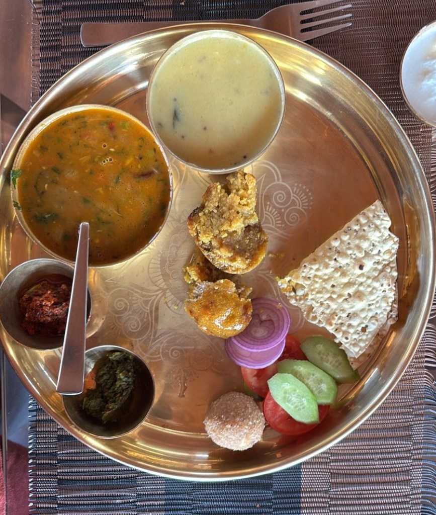Another dal baati churma thali was presented to us as lunch on day # 3 of the trip. A thali this sized with unlimited servings of dal/kadhi/chutney needed larger appetites and stronger digestions than we could boast of. Sadly, we limited ourselves to a few bites of each – every mouthful was scrumptious- knowing we would regret not having eaten more!