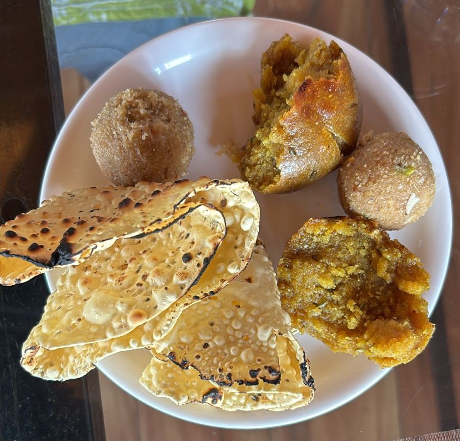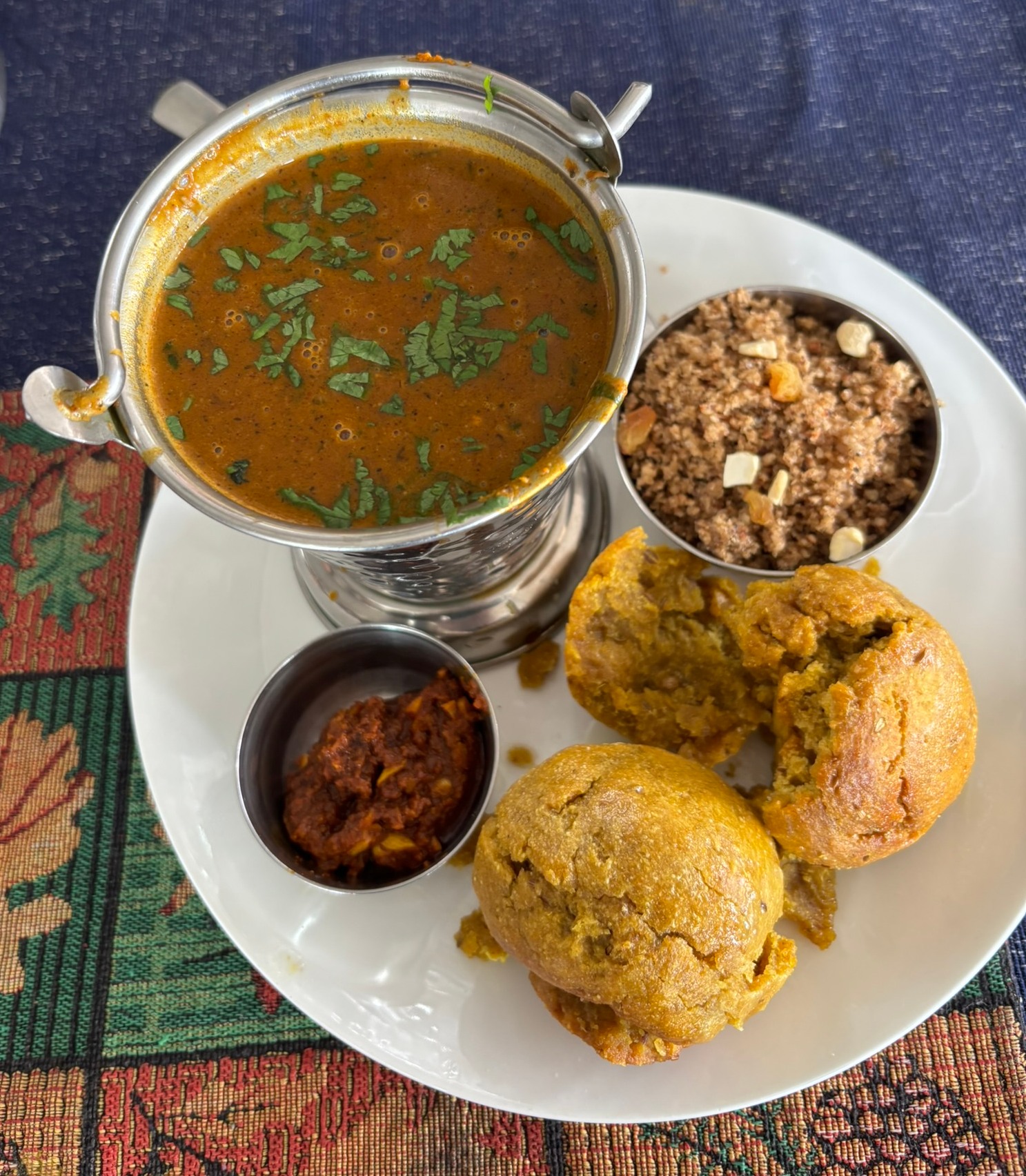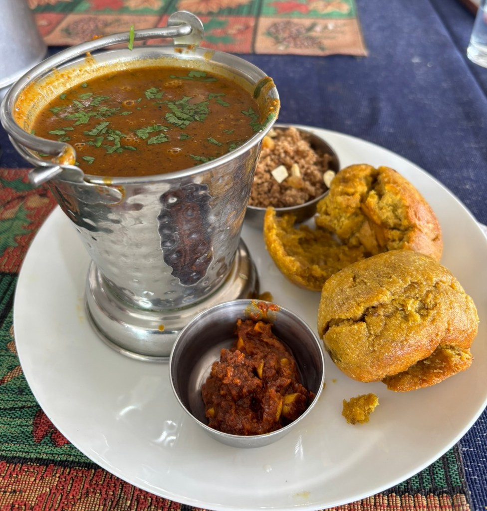The baati is a roll of unleavened wheat flour baked in a clay oven or over coals. It has a hard, crusty exterior and a soft doughy interior which is made even softer by being generously immersed in ghee. The dal is a mix of 5 lentils and spices which is used a topping for the baati or a concoction into which the ghee-soaked baati is crumbled before being scooped up and relished. The churma is the same unleavened flour of the baati which is slathered with ghee (what else) and served as a crumble mixed with nuts. Or gathered up and made into a laddu. Here it’s served as a churma (see the bowl top right)